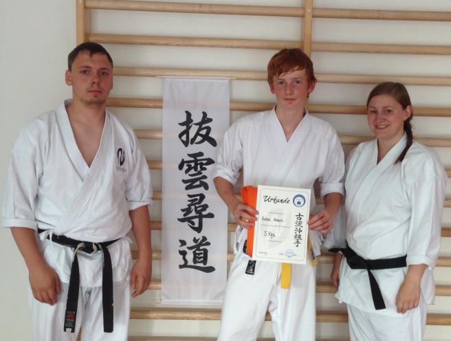 Was jedoch ein wichtiger Bestandteil dieses Textes sein soll, ist ein Mitglied unseres Dôjôs, bei dem ein Auf und Ab an Bemühungen kaum feststellbar ist. Diese Person ist noch recht jung, zeigte sich aber in diesem Jahr durch das proaktive Angebot bei den Kindertrainings zu unterstützen, hat kein Problem sich trotz Arm im Gips den Gi anzuziehen und als Assistent im Training zu stehen und kommt trotz großem Interesse für Fußball am Tag und zu der Uhrzeit des letzten deutschen Vorrundenspiels in das Kindertraining, weil er sich seiner Verantwortung (besonders 2 Tage vor den offiziellen Prüfungen der Kinder) bewusst ist und zeigt dadurch immer wieder, dass er bereit ist zu Geben und zu seinen Zusagen steht. Ruben Andert war an diesem Donnerstag im Kindertraining und half dabei, die Kinder auf ihre Prüfungen vorzubereiten, obwohl er selbst aus terminlichen Gründen nicht an dem offiziell anstehenden Termin am 28.06. teilnehmen konnte.