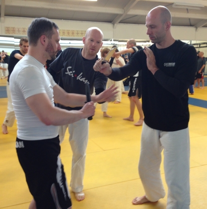 Genau wie vor zwei Jahren, gab es dieses Jahr auch eine Trainingseinheit, in der Übungen mit dem Messer (tantô) geübt wurden. Sollte es jemals dazu kommen, dass man auf der Straße jemandem mit einem Messer begegnet, empfiehlt Sensei McCarthy folgende Dinge (dabei ist zu beachten, dass der zweite, dritte, vierte und fünfte Punkt nur in Anspruch genommen werden sollte, falls der, der jeweils zuvor genannt wird, nicht realisierbar ist):
