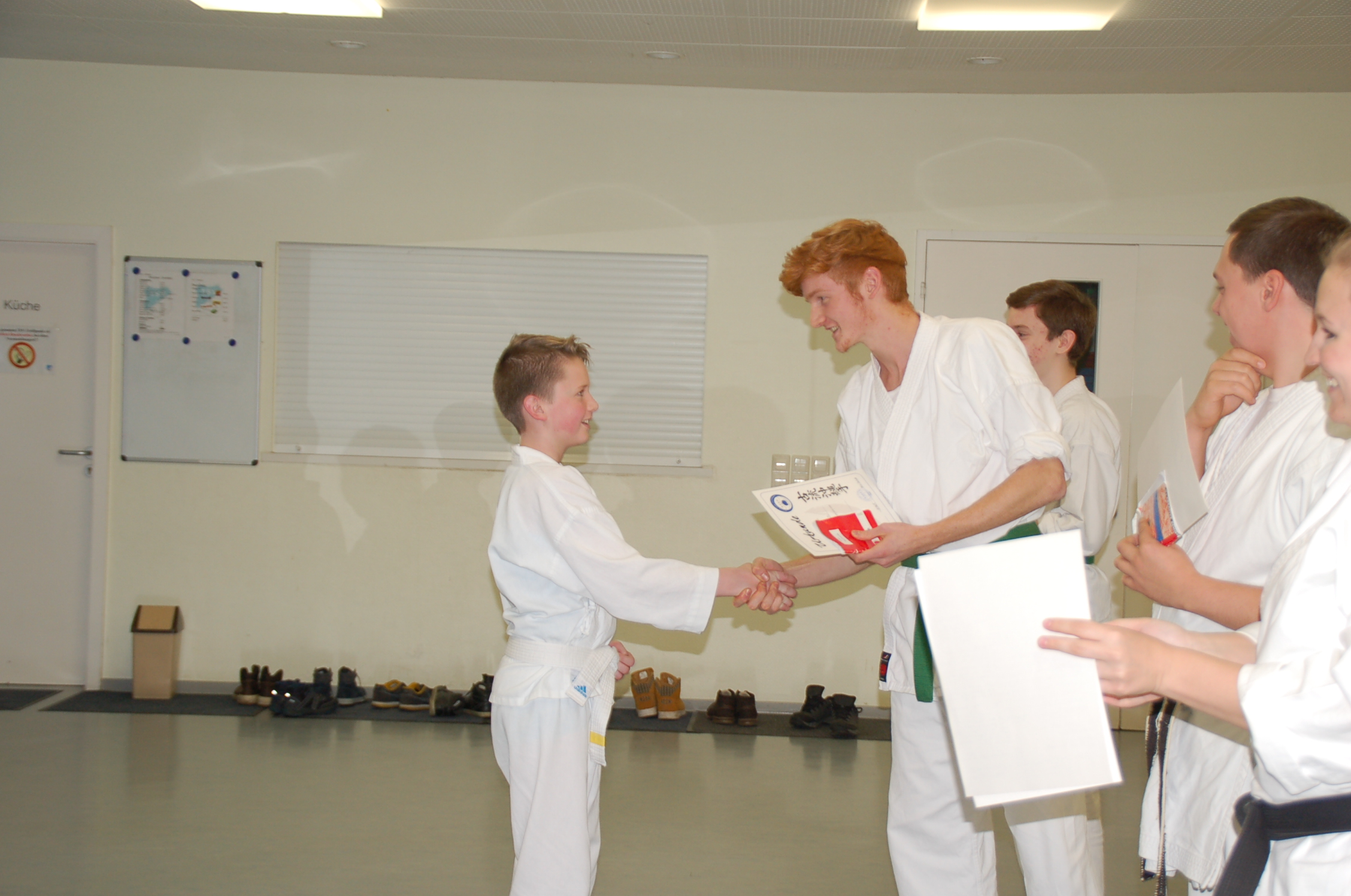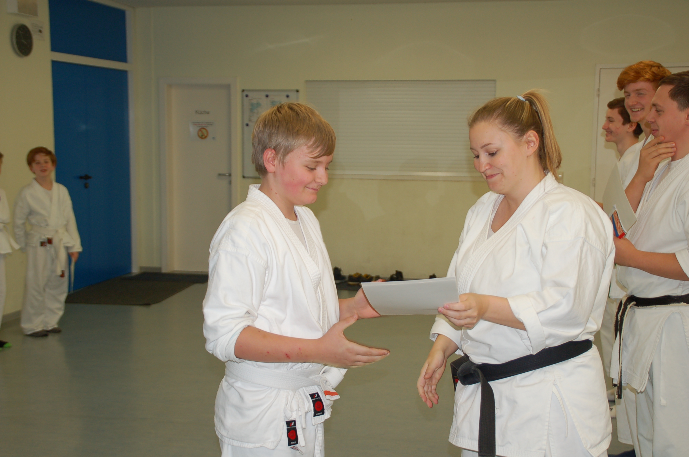 Warum so wenige? Weil die Prüfungsinhalte von Stufe zu Stufe umfangreicher und komplexer werden – und natürlich jeder in einem anderen Tempo lernt und Fortschritte macht. Aber das ist nicht schlimm, im Gegenteil: das macht Karate aus. Wir nehmen an keinen Wettkämpfen teil, sodass sich jeder auf sich selbst, seinen Körper, seine Bewegungen und den eigenen Fortschritt konzentrieren kann. Und während manch einer große Schritte macht, muss ein anderer viele kleine machen um ans gleiche Ziel zu kommen. Das Geheimnis dabei ist, nicht aufzugeben und immer wieder den Kampf mit sich selbst und seinem eigenen Ego aufzunehmen. Denn nur wer sich selbst besiegt und kontinuierlich an sich arbeitet, kann sich verbessern und einen Schritt nach vorne gehen.