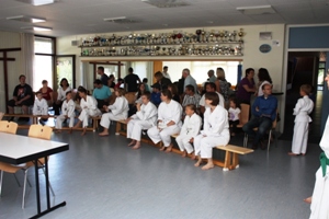 Es ging pünktlich um 9:00 Uhr los und es waren alle Gärtringer Karateka einschließlich mir gekommen. Heute wollten wir den ganzen Zuschauern zeigen, was wir gelernt haben. Erst kamen die Prüflinge aus der Kindergruppe dran, dann die der Jugend-/Erwachsenengruppe.