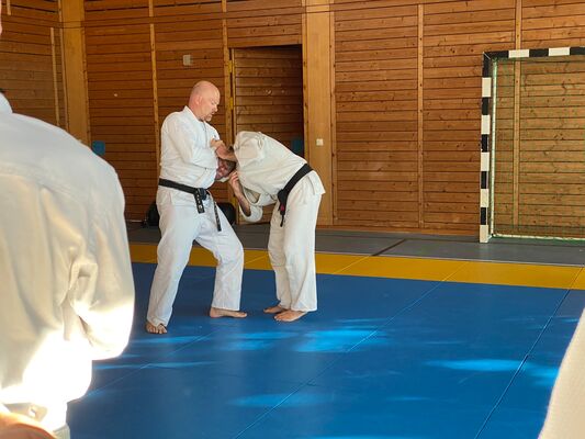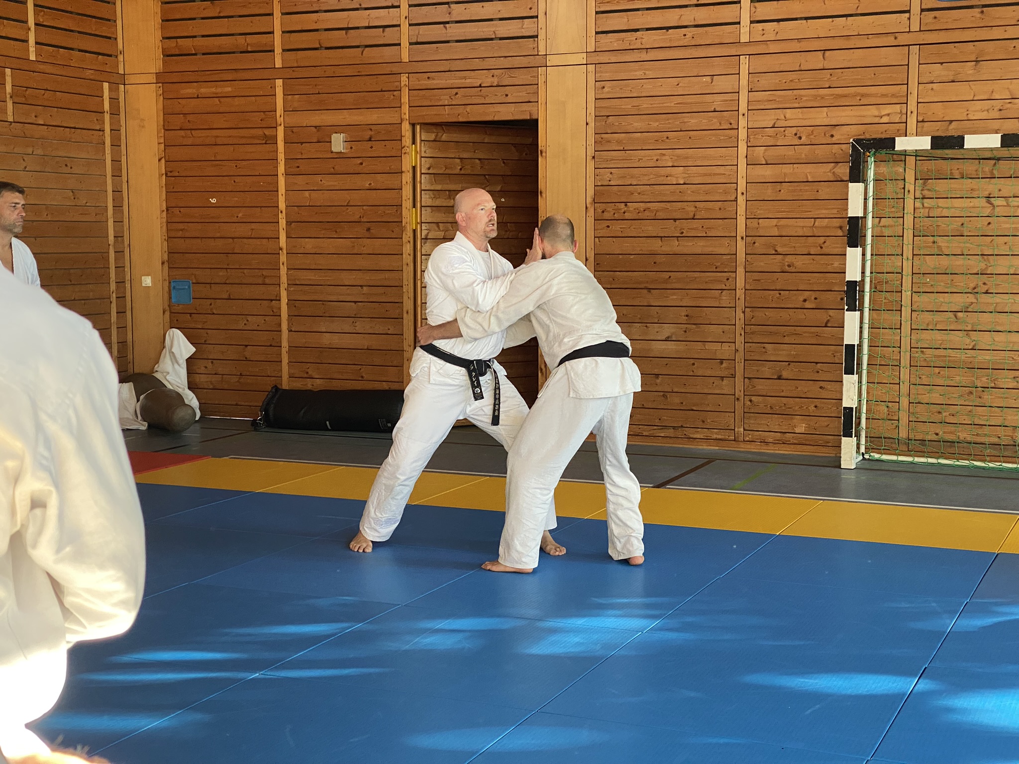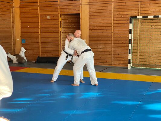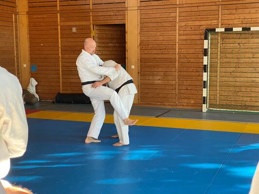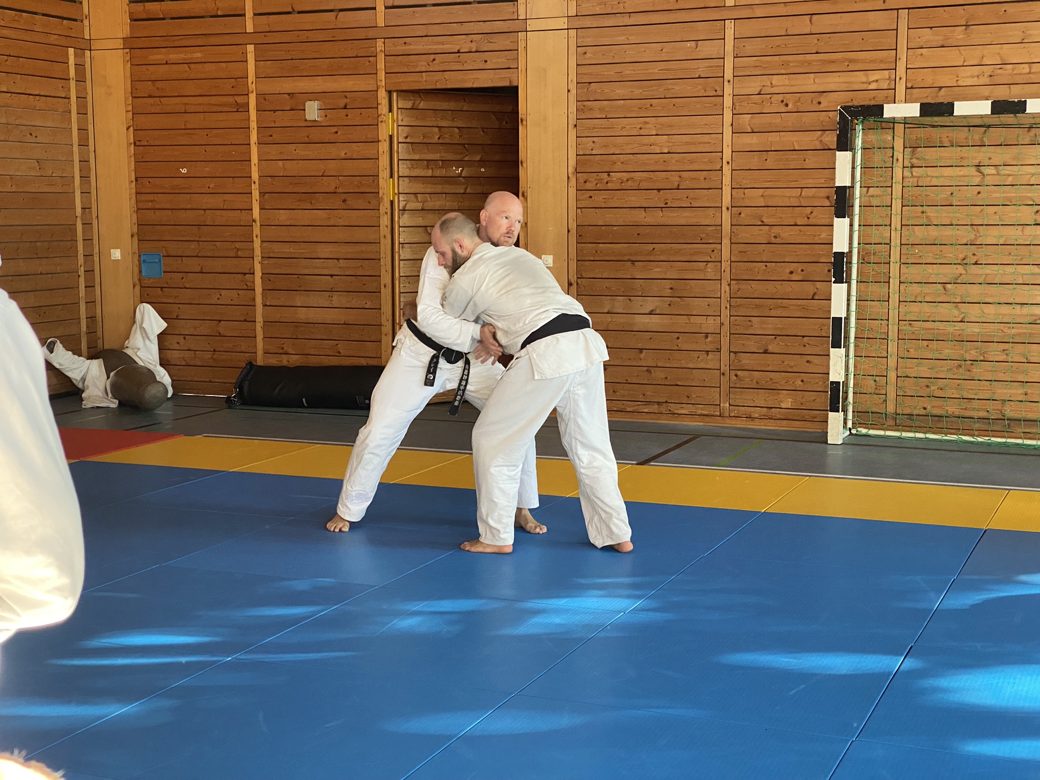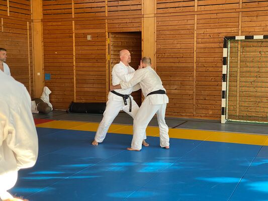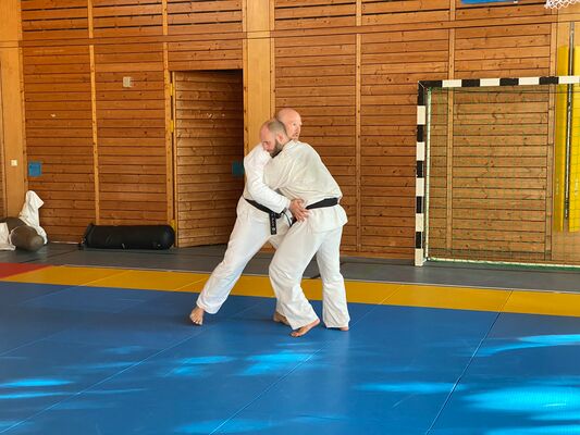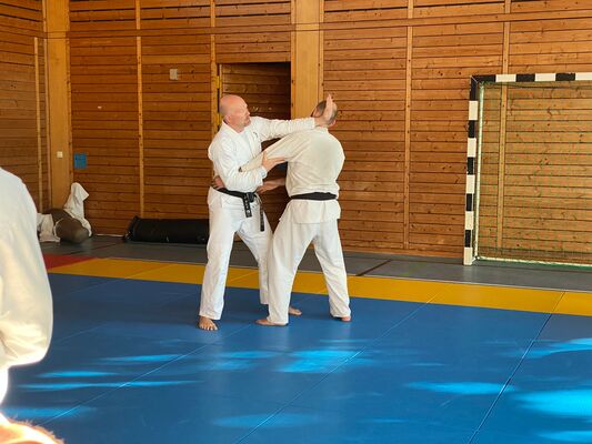 Am ersten Tag des Seminars unterrichtete Olaf Krey die Keri Waza Form. Auch wenn ich sie schon einige Jahre übe, lassen sich immer wieder Details zur Verbesserung finden, wie bspw. den Winkel einer Bewegung zu ändern, die Höhe eines Tritts zu hinterfragen oder die Ausrichtung des Standbeins zu prüfen. Auch bei der Partnerübung gab es ein paar Korrekturen, auf die ich in der kommenden Zeit im Training eingehen werde.