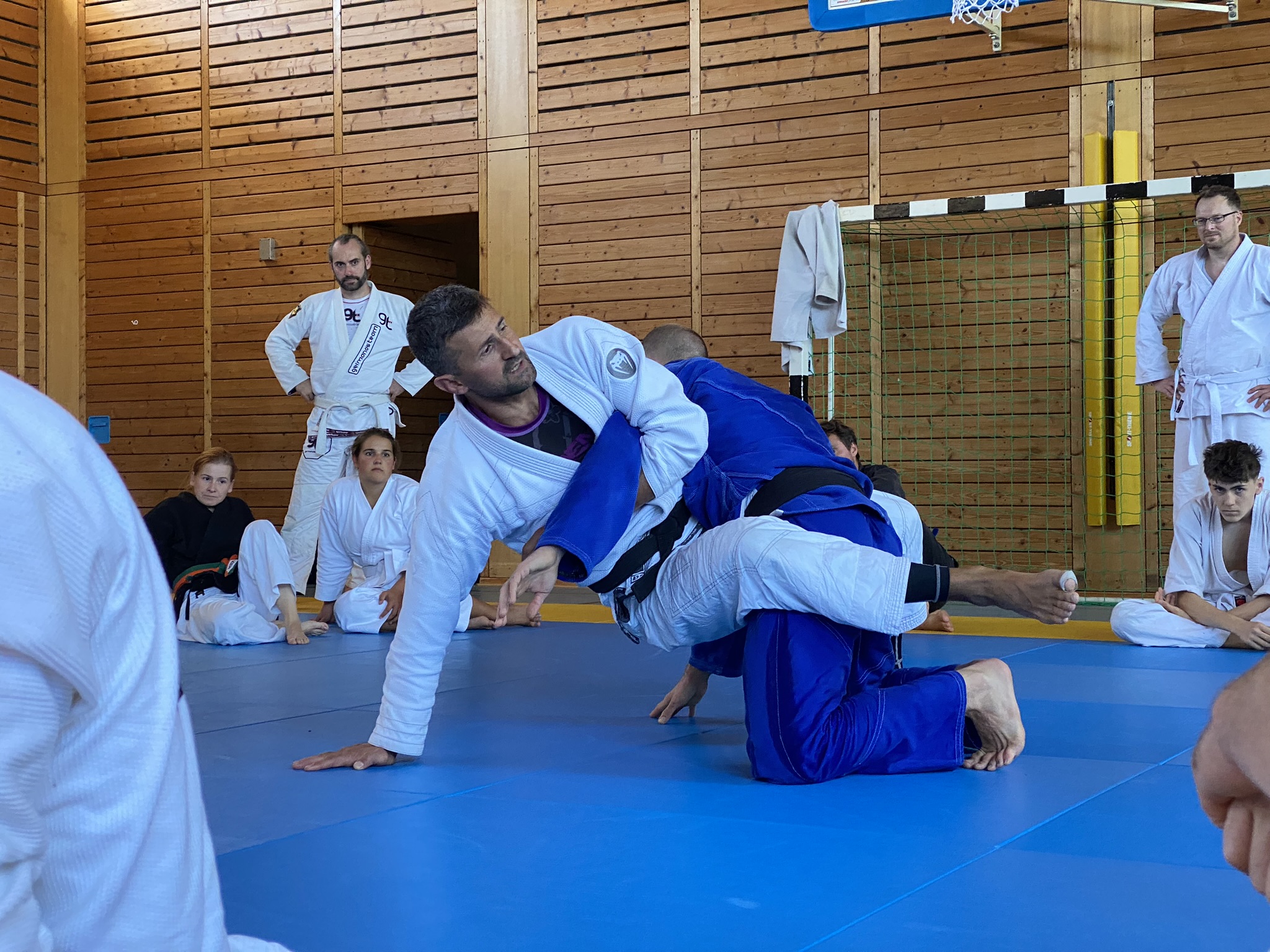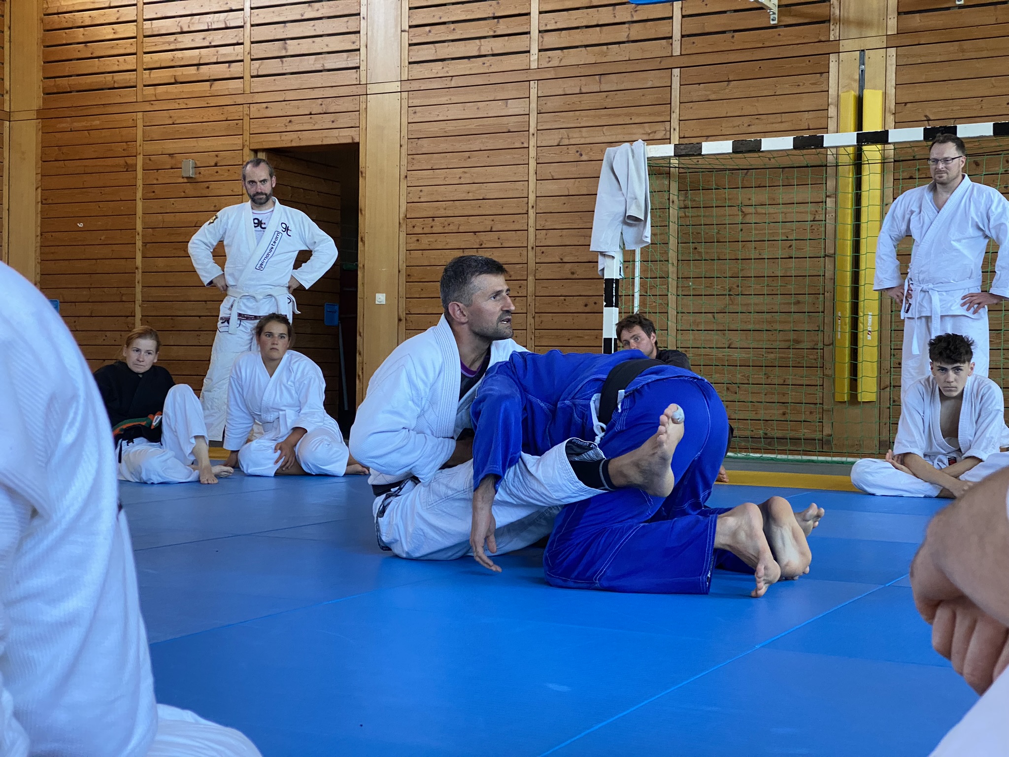 Am zweiten Tag unterrichtete Andreas Seredin „Grundlagen“ am Boden. Einer der ersten Hinweise von Andreas war sich am Boden rund wie ein Ball zu bewegen. Er ergänzte, dass er einen Vorteil darin sieht, wenn er das Gewicht des Gegners auf sich aufladen kann und sich anschließend wie ein Ball weiterbewegt. Mit dieser Taktik kann er auch mit schwereren Gegnern gut arbeiten.