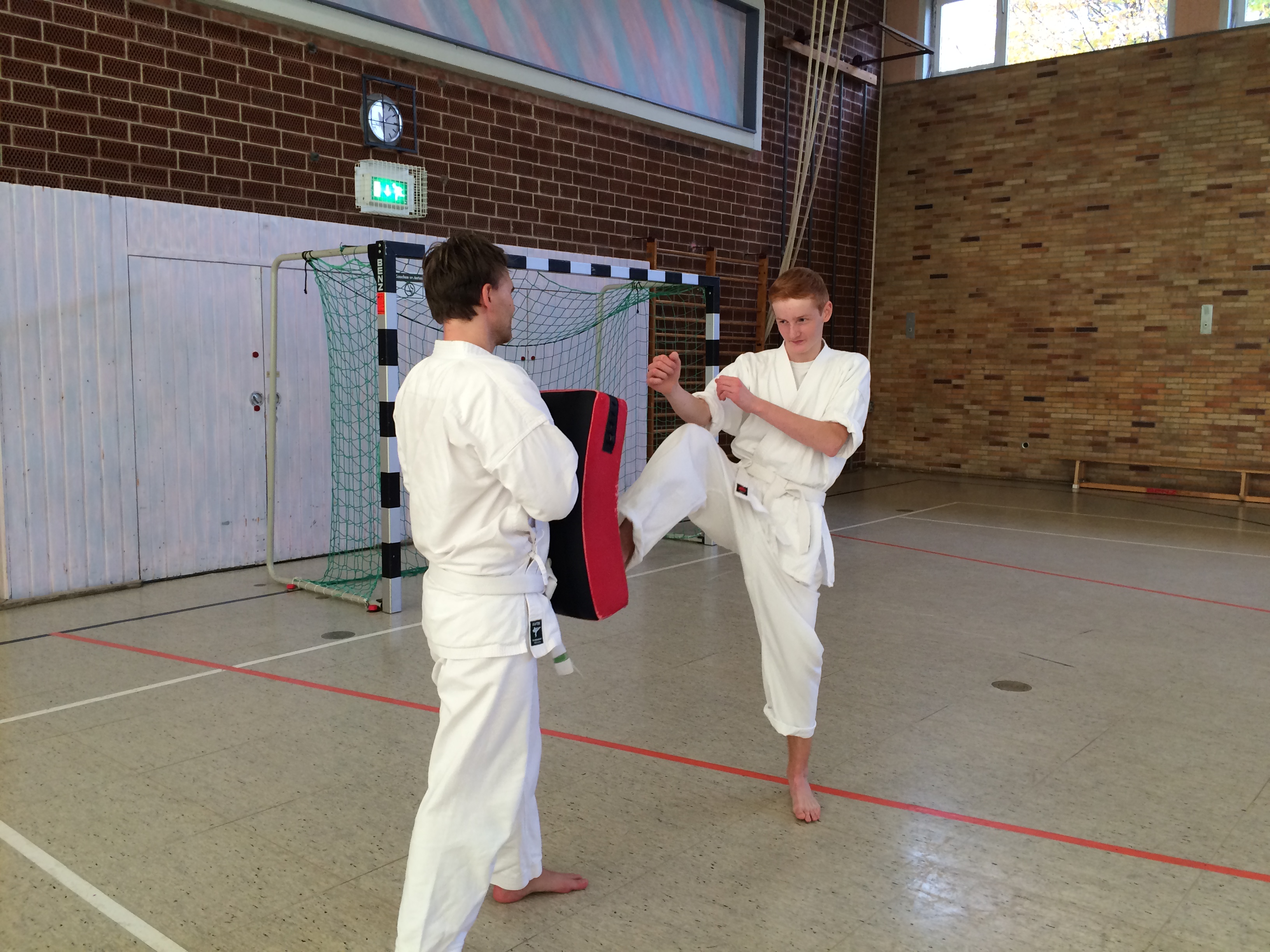 Am Sonntagmorgen mussten wir schon um 9 Uhr in der Halle sein. Olaf hat uns noch einmal Tegumis, Fußtritte und den Umgang mit dem Bo gezeigt.