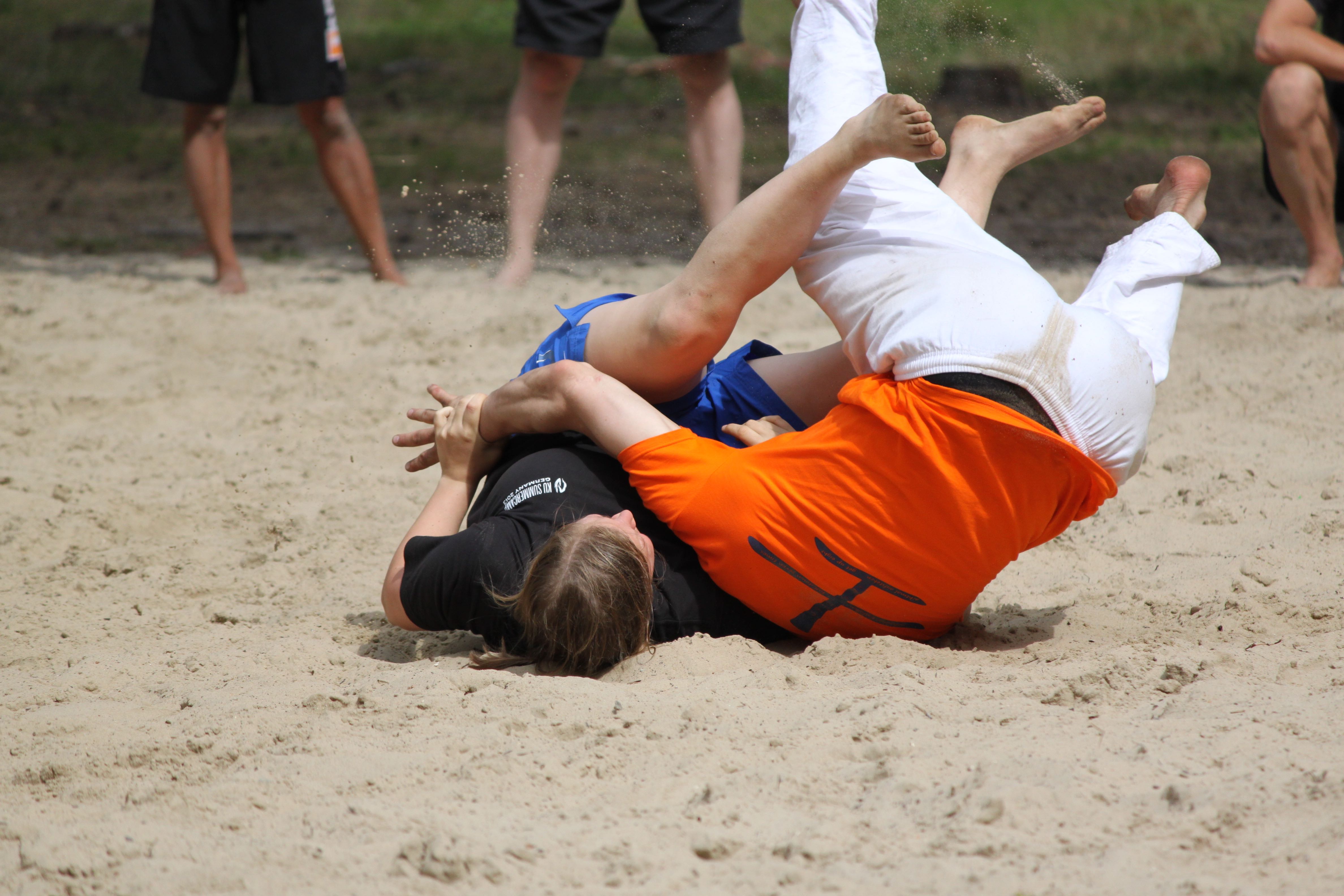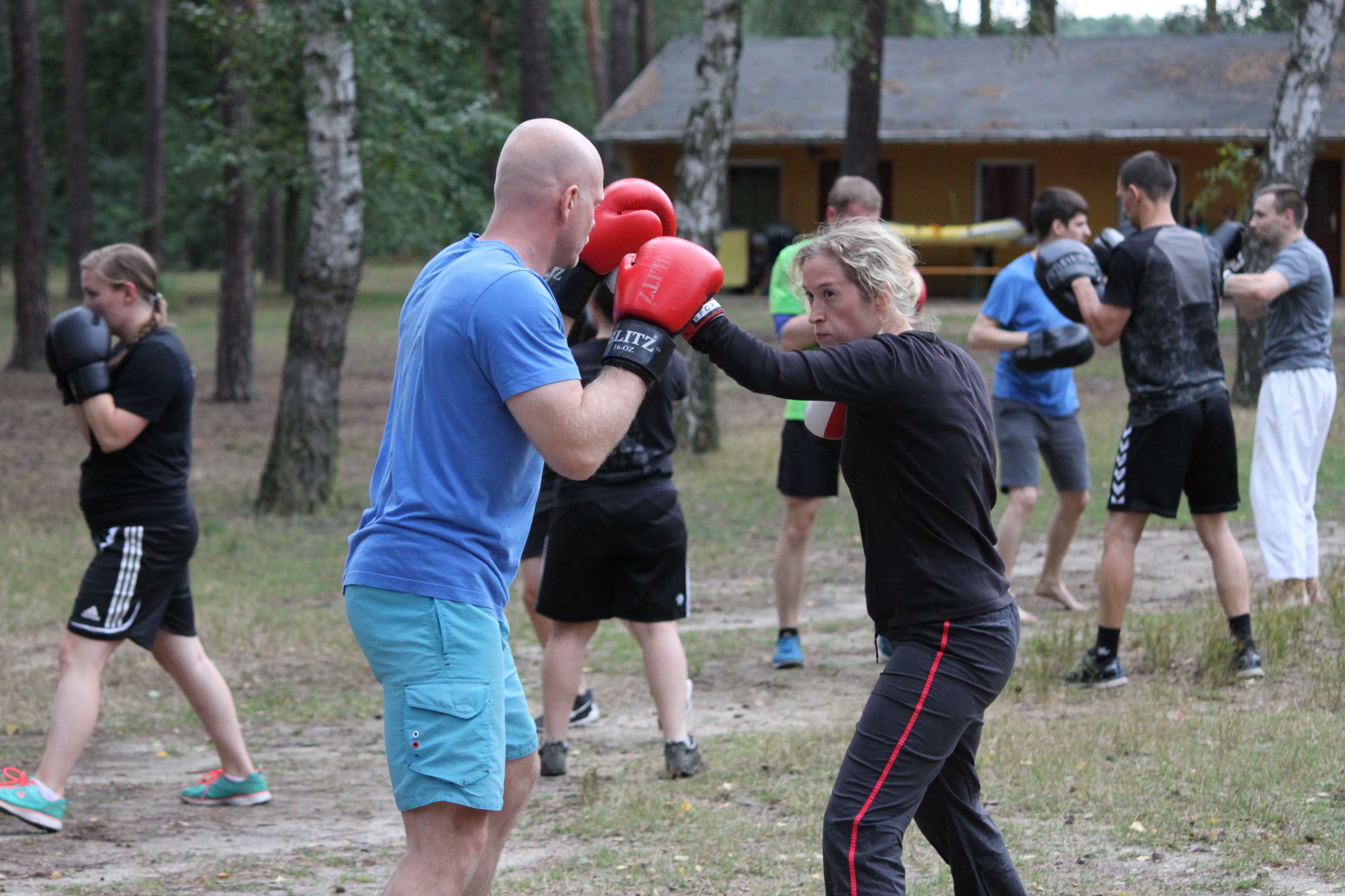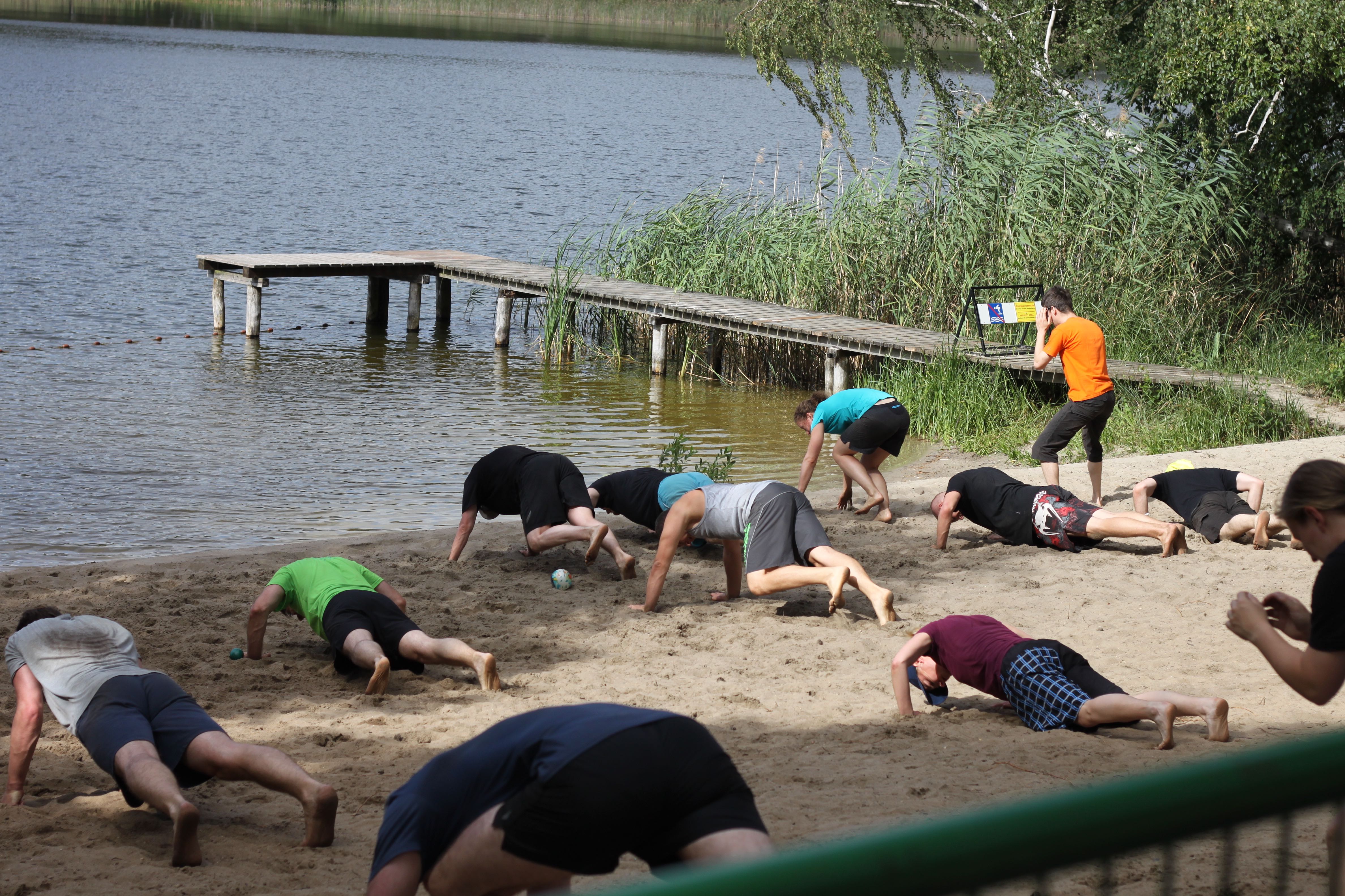 müde die Äuglein öffnen – kurz abwägen ob man joggen gehen kann/will – weiterschlafen – frühstücken – Powernap – Vormittagstraining – Bälle hin- und herwerfen – „FIVE!“ – Liegestütz – einen Ball weiterwerfen – „FIVE!“ – Liegestütz – aus dem Sand aufstehen – „FIVE!“ – Liegestütz – … – Kihon – Partnerwechsel – taisabaki takedowns – Sand überall – nach dem Training kurz in den See springen – Mittagessen – Powernap – Theorie-Einheit mit Sven und Dinah – Warum machen wir Karate? – in sich reinhören – den Ideen von anderen lauschen – Austausch in Kleingruppen – Formulierung von Wochenzielen – weitergehende Gespräche mit lieben Menschen über Probleme/Sorgen/Erfahrungen – Abendessen – Boxtraining – müde aber glücklich duschen – gemeinsam den Abend ausklingen lassen – gemeinsam lachen – schlafen