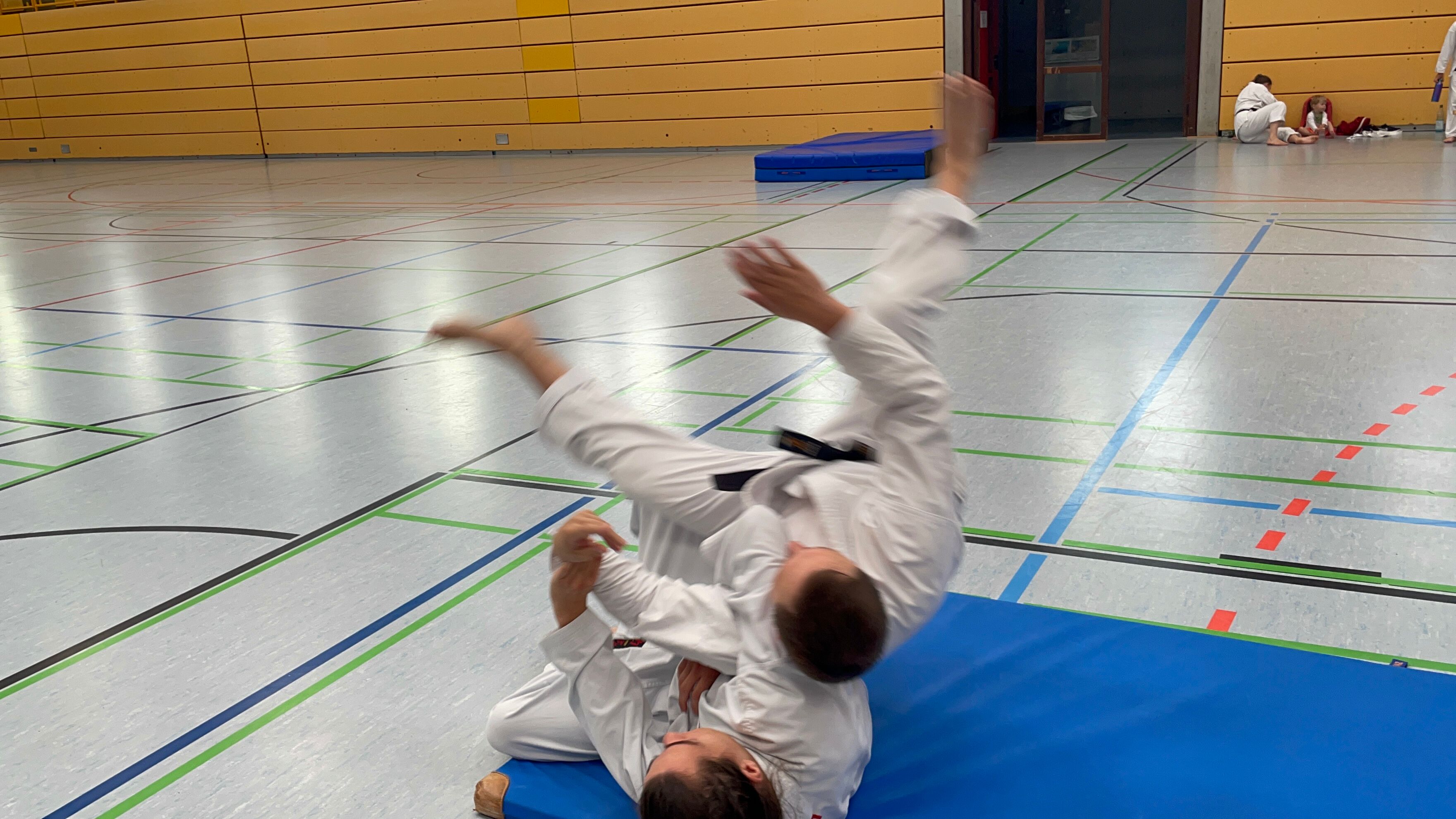 Anschließend widmeten wir uns einem Teil der Einzelform der Kata Chokyu, bei der die Kinder von den Fortgeschrittenen abschauen konnten. Danach übten wir ein Paar TakeDowns und auch Würfe. Hierbei trainierte immer ein Kind mit einem Fortgeschrittenen. Nun gab es ein kleines Handpratzentraining, bevor es dann wieder zum Spielen überging. Zuerst spielten wir Völkerball und im Anschluss Karateball (Zombieball). Dabei wurden clevere Taktiken entwickelt und viel geschwitzt. Besonders den Kindern machte das Spielen sehr viel Spaß, sodass sie gar nicht mehr aufhören wollten.