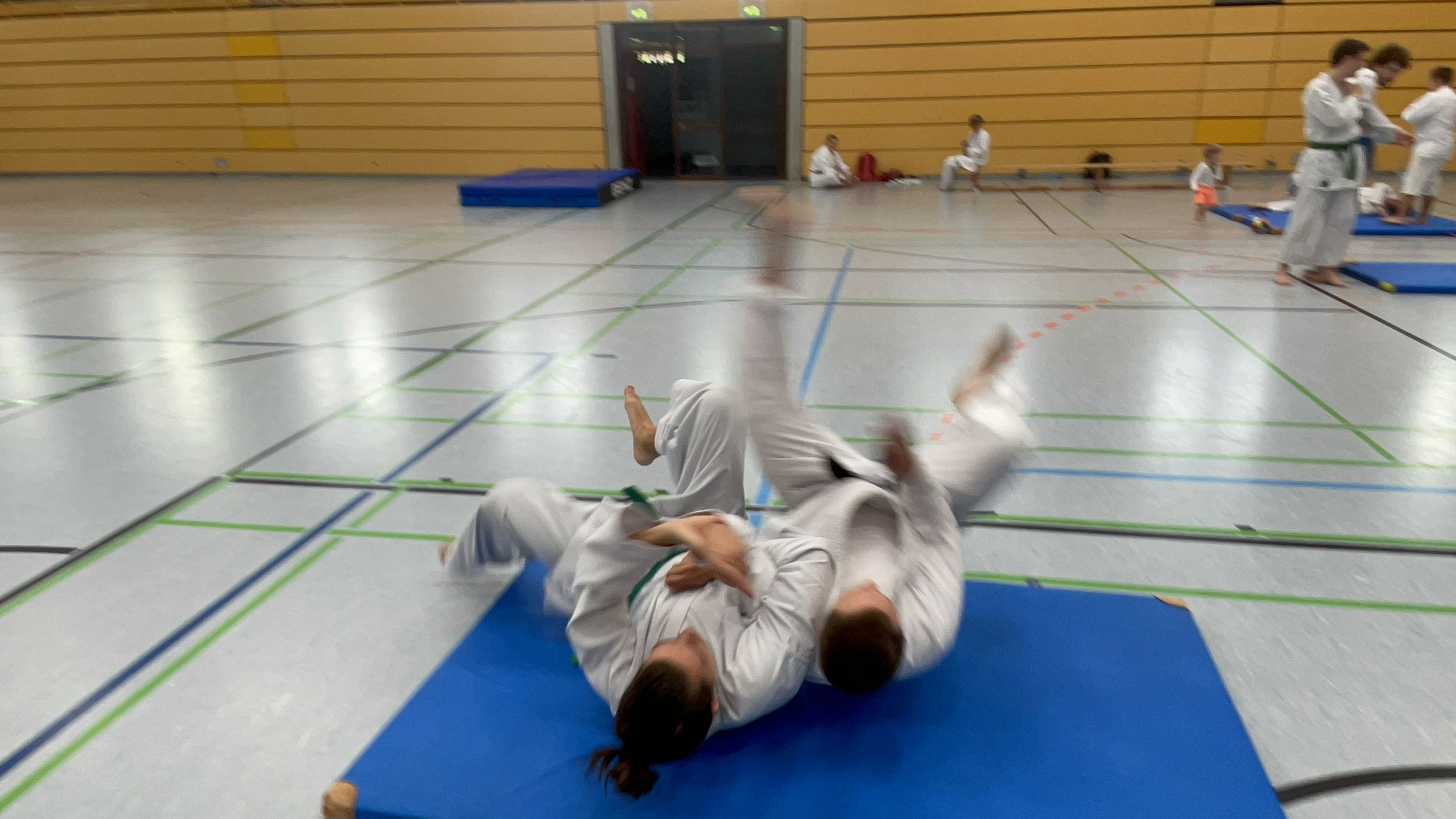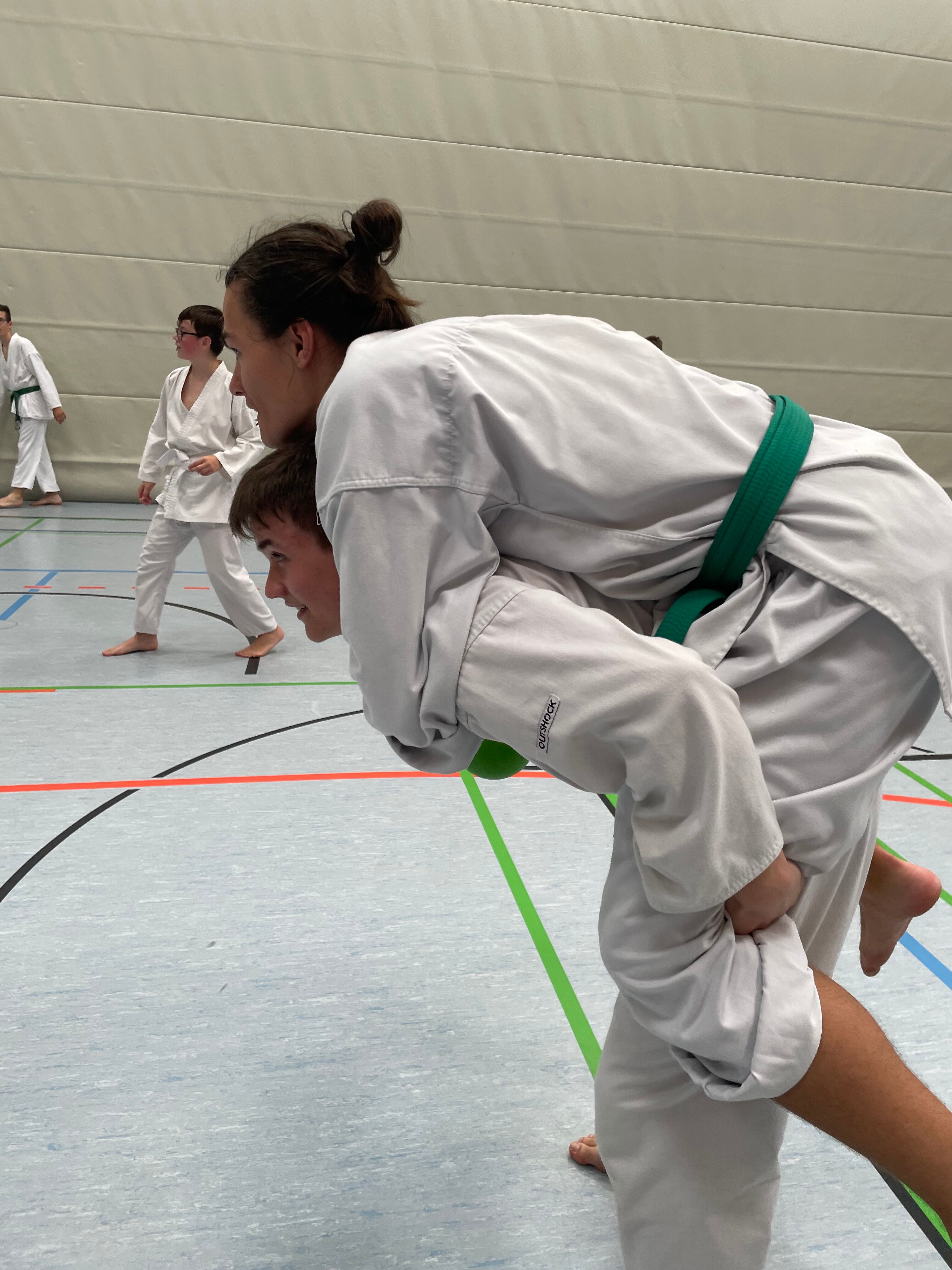 An diesem Tag war es sehr warm, sogar schon morgens um 9.30 Uhr, als das Training begann. Am Anfang spielten wir ein Paar Spiele, um uns besser kennenzulernen, denn die Kinder- und die Jugend-/Erwachsenengruppe trainieren nur selten zusammen. Dazu gehörte auch ein Mattenrennen mit mehreren Teams, bei dem man mit zwei Matten vorankommen muss, ohne diese zu verlassen.