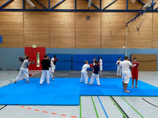 Felix hat die letzte Einheit geleitet, in welcher es um Pratzentraining ging. Hierbei hält jeweils ein Partner die Pratze, während der andere in einer bestimmten Abfolge schlagen muss. Wir haben vor allem Abfolgen trainiert, welche normalerweise eher außer Acht gelassen werden, so zum Beispiel zuerst einen gyaku zuki (Cross) und dann direkt zwei linke mawashi zukis (linke Haken) direkt hintereinander. Dieser Trainingsabschnitt endete mit einer runde "Umgebungsraten". Dabei steht eine Person mit geschlossenen Augen in der Mitte eines Kreises und die anderen berühren die Person in der Mitte jeweils und diese muss vorher erkennen, woher die Personen kommen. Das Spiel dient vor allem dazu, ein Gefühl zu bekommen, wo die Angreifer herkommen.
