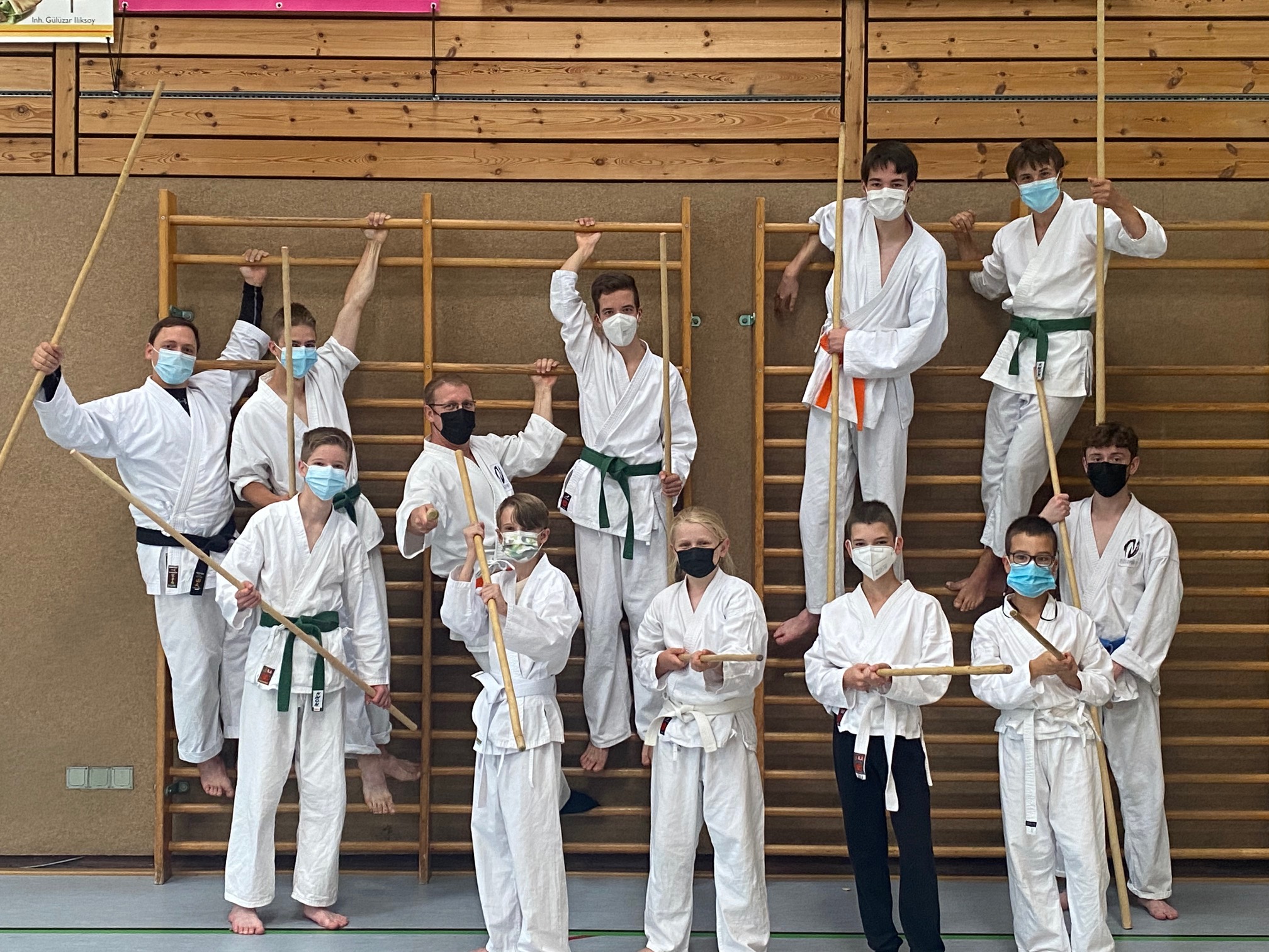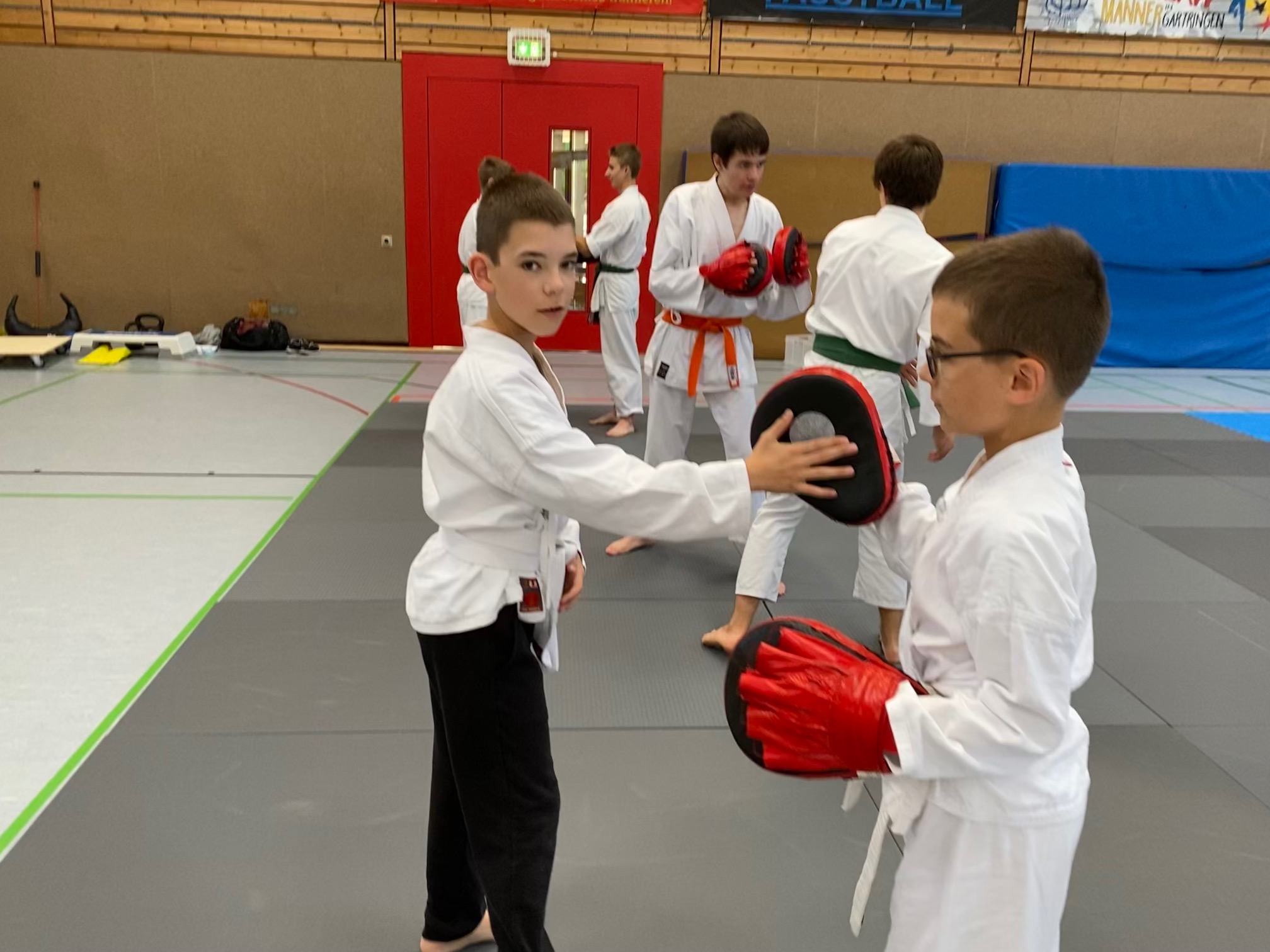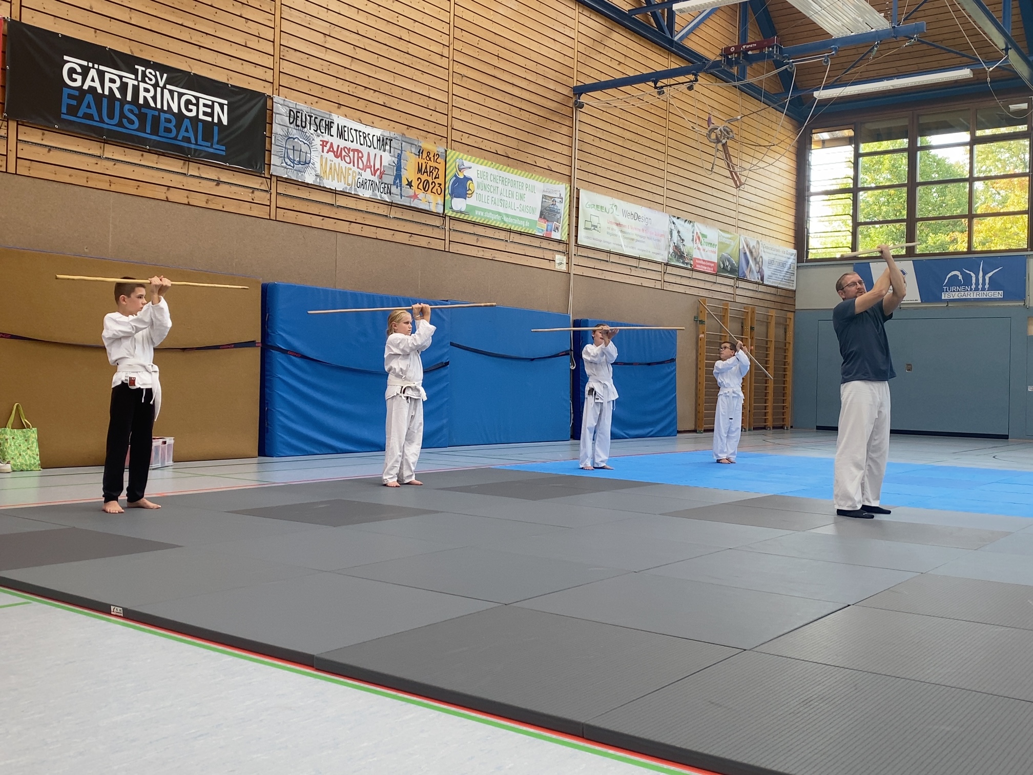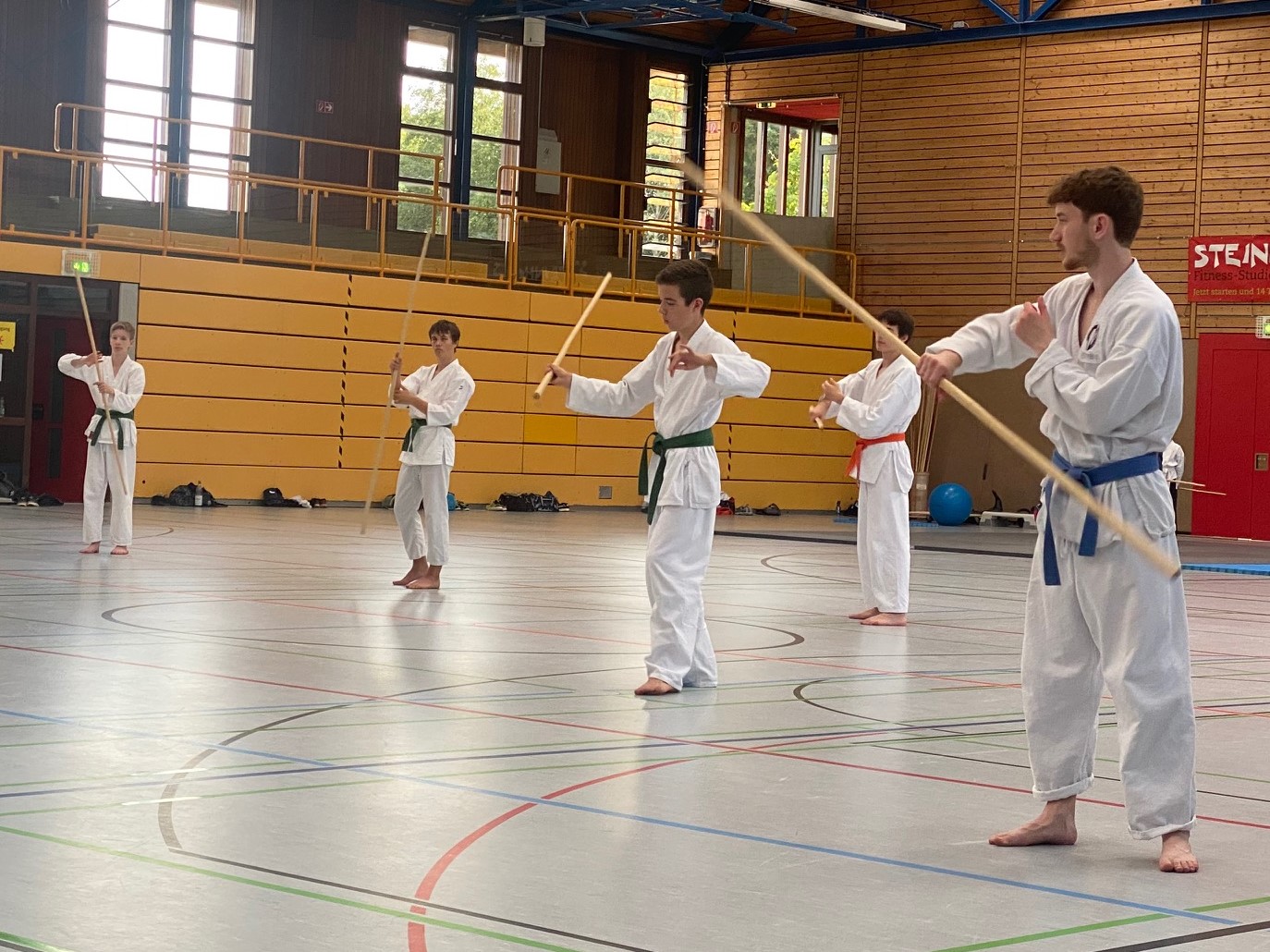Diesen Samstag fand ein Trainingstag in Gärtringen statt. Der Tag war in drei unterschiedliche Abschnitte geteilt nämlich von 10-12 Uhr, von 13-15 Uhr und von 15:30 bis 17 Uhr. Da ich allerdings am Wochenende sehr lange schlafe, habe ich das Morgentraining leider verpasst und nahm erst nach dem Mittagessen am Training teil. Das war allerdings kein Problem, da wir nach dem Essen, um warm zu werden, zuerst ein Zirkeltraining machten und dann die Handpratzen holten. Da zwei Teilnehmer dazugekommen waren, musste sich auch niemand umstellen und jeder konnte mit dem Trainingspartner vom Vormittag weiterüben. Wir schlugen dann bis um 15 Uhr auf die Handpratzen, und da es sich hierbei um sehr einfache Kombinationen handelte, kamen alle mit. Zwar taten mir dank dem ganzen Schlagen an den nächsten Tagen die Arme weh, allerdings fühlt es sich immer wieder gut an, wenn man auch gegen ein stabiles Objekt haut, was man im Normal- und Idealfall nicht wirklich kennt. Nach dieser Trainingseinheit hatten wir eine kurze Pause mit ein paar Stücken Kuchen zur Stärkung. Im letzten Teil des Trainings übten wir mit dem Bo (Langstock) und die Erfahreneren prägten sich in der ersten Hälfte alle Verteidigungen wieder ein, welche sie in den vielen Monaten seit dem letzten Bo-Training verlernten, während den noch nicht sehr Erfahrenen einige Grundtechniken beigebracht wurden. Zum Ende der Trainingseinheit wurde noch ein wenig das Bo-Handling geübt. Ganz zum Schluss gab es noch ein wenig Krafttraining mit dem Bo.