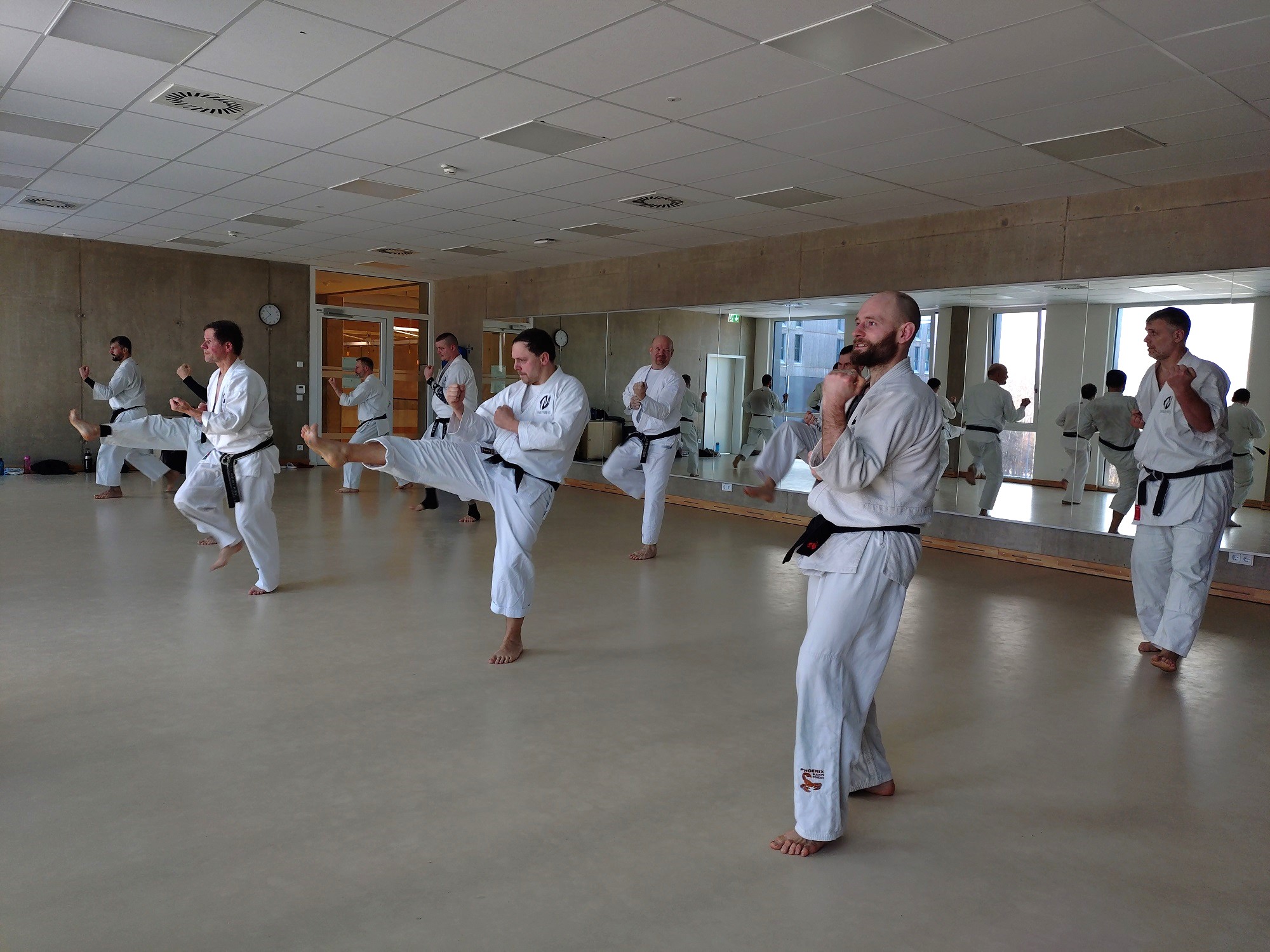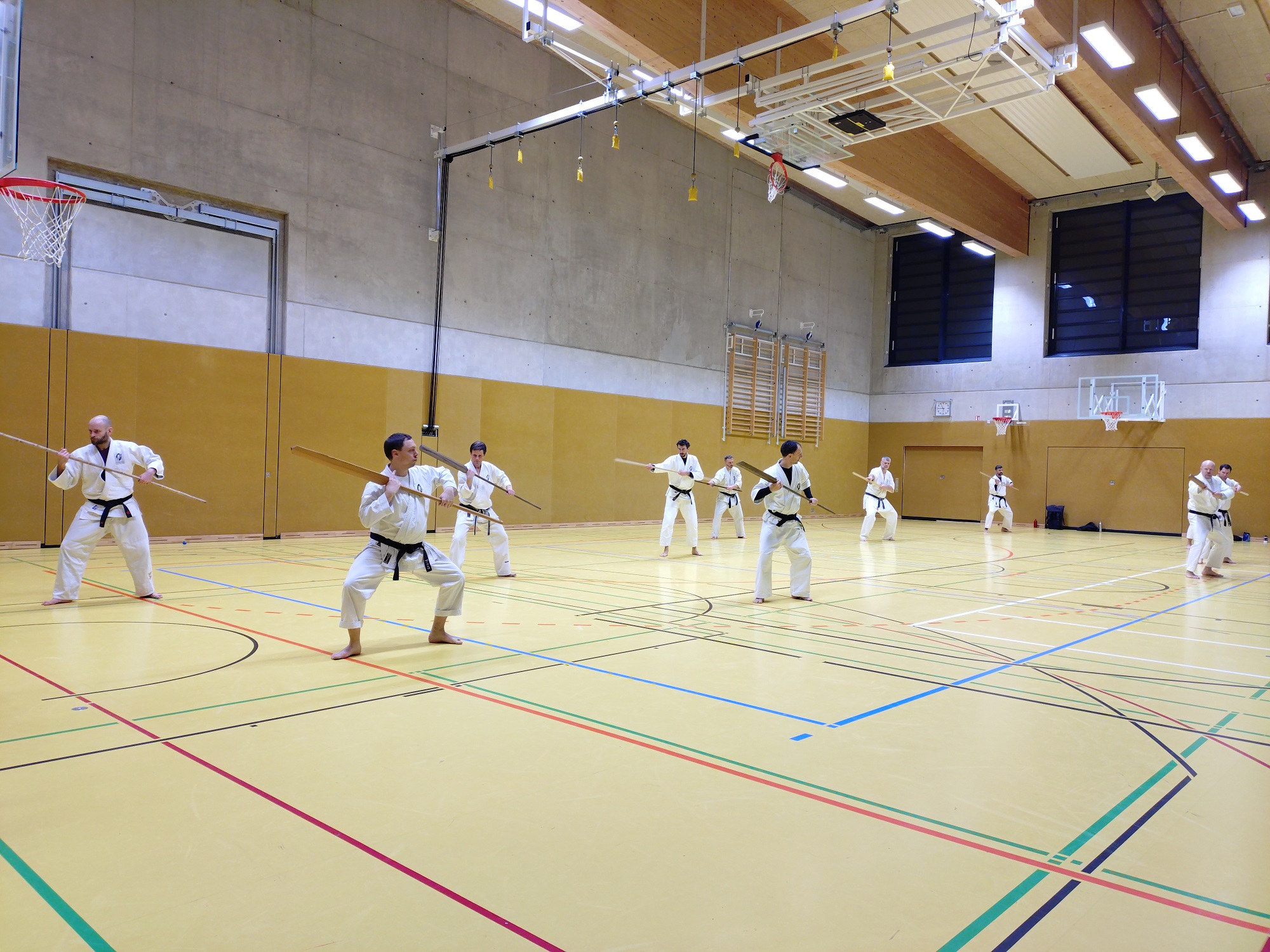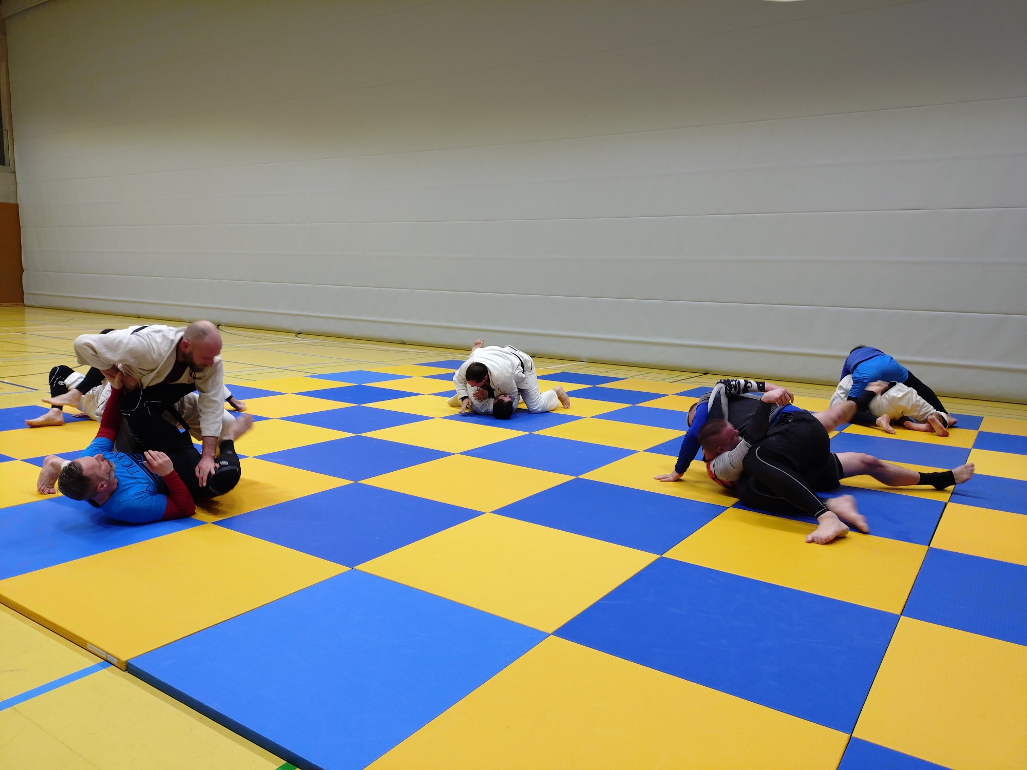 Wir widmeten uns an diesem Wochenende wieder einmal sehr schönen Themen, wie Boden auf dem Schachbrett (siehe Bilder), einer Abwandlung zur Anwendung der Kata Chokyu, der Übung mit dem Eku und machten einen kurzen Rundumschlag durch alle Tegumis.
